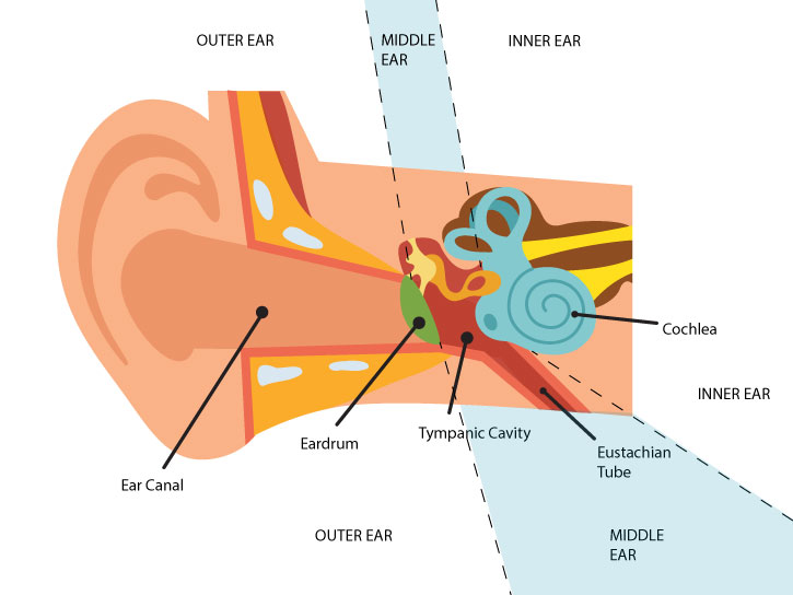This diagram shows the middle ear section of the ear where fluid can accumulate, causing a blockage between the outer ear (where sound enters) and the inner ear (where sound waves are turned to electrical signals, and sent on to the brain).